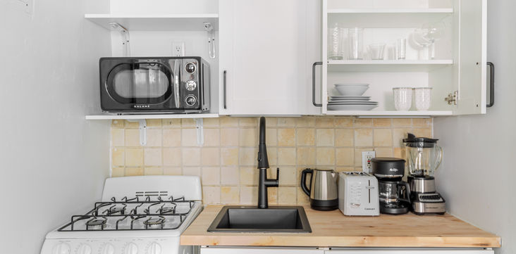 Living space with cozy sleeping area makes it live like a one bedroom. Cute kitchen space fully equipped with everything you need to feel at home.